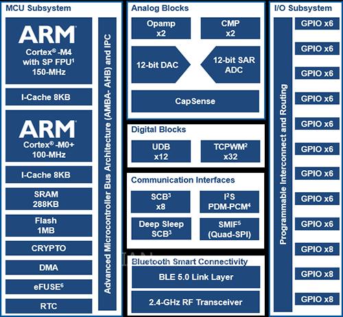 扩充处理器容量、内存及功耗方面的性能不会凭空而来。对于许多应用程序而言,底层硬件(例如MCU)需要做出相应调整以适应这些特性。因此,生产商在设计下一代MCU时必须时刻紧记这些要求。例如,赛普拉斯 PSoC 6 BLE MCU(见图1)为物联网设计人员提供BLE 5.0所具备的这些功能。