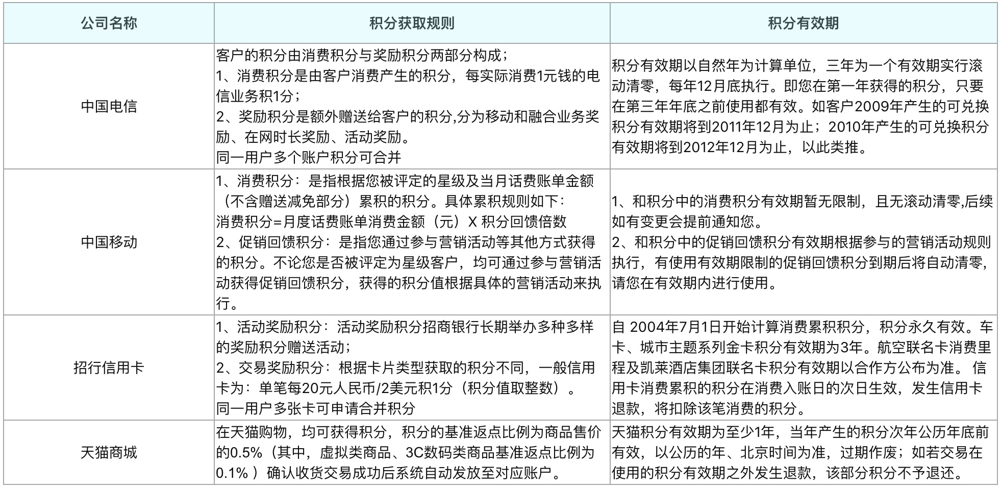 这部分我们拿生活中经常使用的中国电信、中国移动、招商银行信用卡、天猫商城做一个案例分析,这几种业务相对来说都具有一定代表性的,通过分析这些常用业务的积分规则,我们大致就能够了解某个行业对积分规则的设定的大致规则。