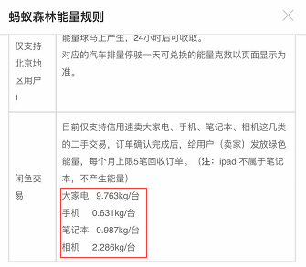 引人深思的是:闲鱼交易的能量获取规则,相比其他的线下支付反而高出数十倍,卖出一台相机可以获得2.286kg的能量。