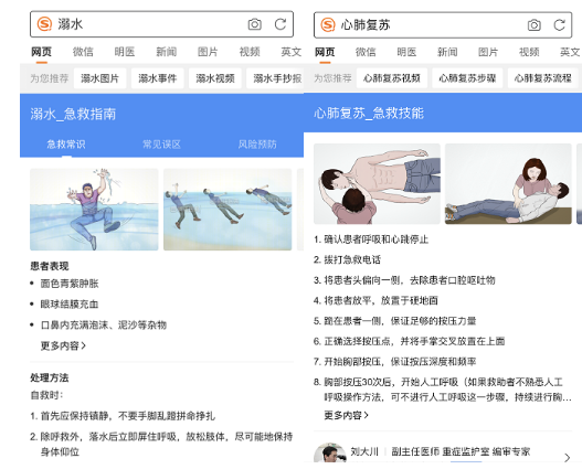 如果想针对某种特定急救状况进行查询,也同样很方便。以溺水为例,用户直接在搜狗搜索中输入关键词“溺水”,结果页就会直接展示溺水的急救指南。其中包括了对溺水患者表现的描述,并提供了详细的处理方法。与此同时,也对可能出现的一些急救误区进行了提醒、对溺水的风险预防进行了说明。此外,搜狗搜索急救指南中还贴心提供了多动图的展示形式,让用户能够更好地理解和学习比如“心肺复苏”等各类急救技巧。